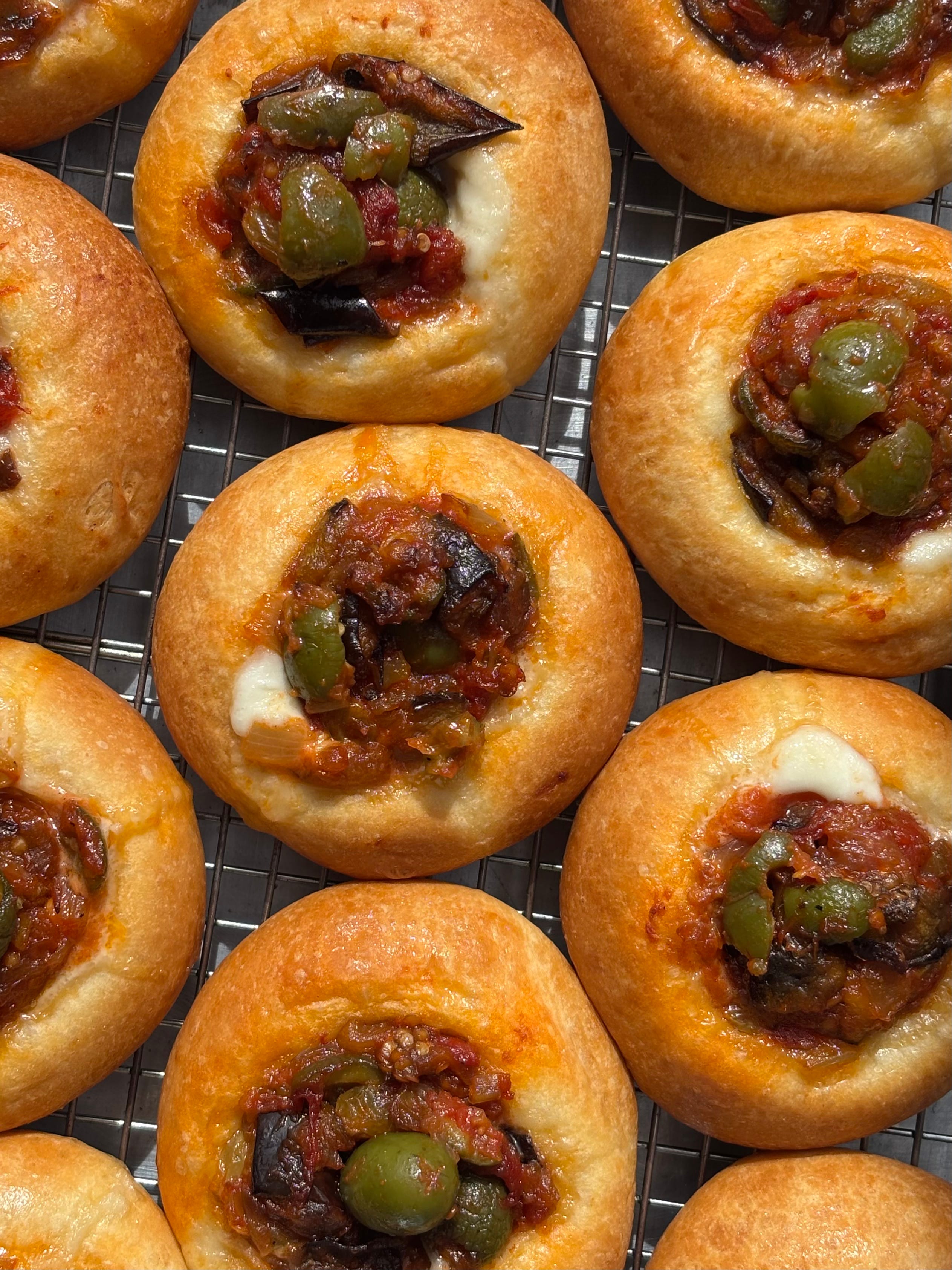 Note: if you’d like to add a cheese element to your kolache, you can tuck balls of fresh mozzarella under the caponata - you’ll need 14. You could also use goat cheese or a thick, strained ricotta beaten with an egg yolk.